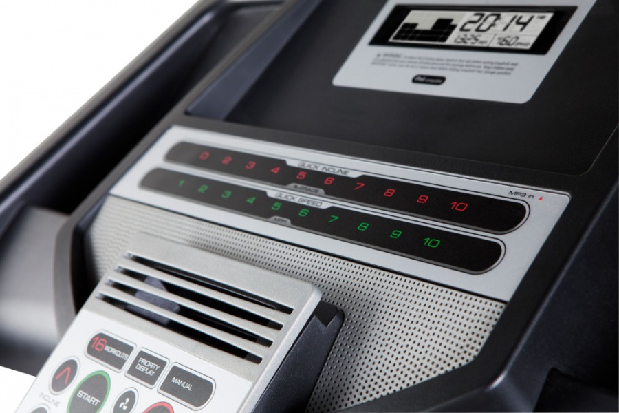 Показания консоли  время тренировки, пройденное расстояние, интенсивность тренировки, сожженные калории, угол наклона бегового полотна и его скорость, пройденный перепад высот, частота пульса, графический профиль тренировки